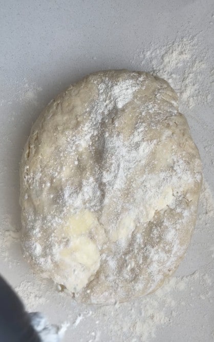 Travaillez à la première vitesse avec le robot jusqu’à obtenir ce résultat, cela prend environ 1 minute. Le beurre doit être bien réparti mais non absorbé. Donc même si vous voyez la pâte avec des morceaux de beurre disséminés, ne vous inquiétez pas. Farinez légèrement le plan de travail et versez la pâte
