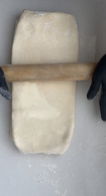 Étalez à nouveau la pâte feuilletée. Il est très important de l’étaler en gardant toujours la jointure des côtés longs à votre droite