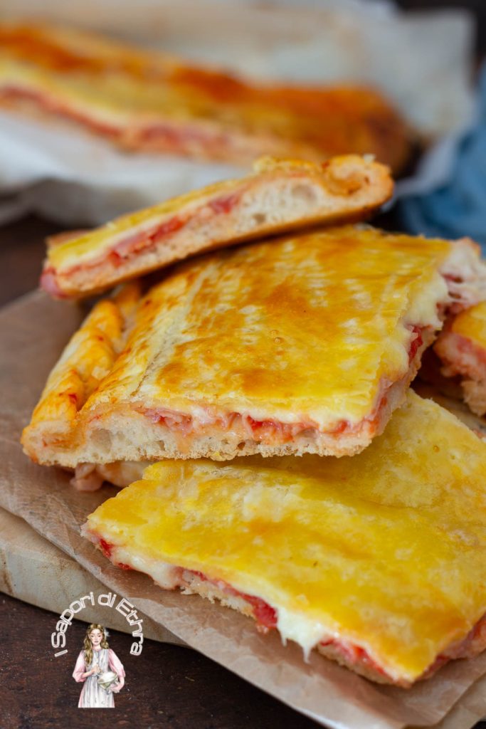 Si tu es allé à Naples, tu ne peux pas ne pas avoir goûté la fameuse PIZZA PARIGINA DE LA TRADITION NAPOLITAINE. Ce n’est rien d’autre qu’une délicieuse pizza rustique composée de deux pâtes différentes, celle de la pizza et celle de la pâte feuilletée, qui contiennent du jambon cuit, de la tomate pelée et du caciocavallo ou provola. Je te garantis que c’est vraiment quelque chose de très tentant. J’ai utilisé une pâte feuilletée achetée, mais si tu as envie ou le temps de la faire toi-même, ce serait l’idéal. Mon rouleau de pâte feuilletée acheté était un peu petit, alors j’ai dû en prendre deux et faire un ajout. Naturellement, la classique est faite avec cette garniture, mais tu peux parfaitement la personnaliser avec ce que tu préfères. J’ai d’ailleurs ajouté aussi de la mozzarella. On dit qu’elle s’appelle ainsi parce que “Parigina” signifie simplement “pour la reine”, et qu’une reine de Naples a eu une pizza tout spécialement dédiée à elle.