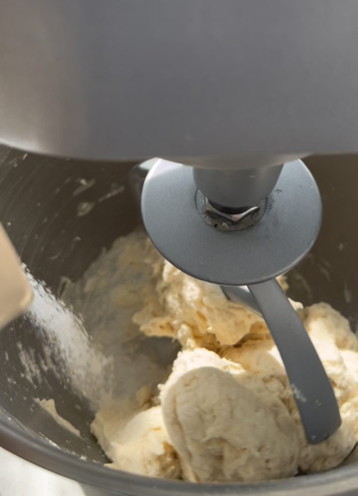 Quand la pâte devient lisse, transférez-vous sur le plan de travail et façonnez légèrement la pâte.