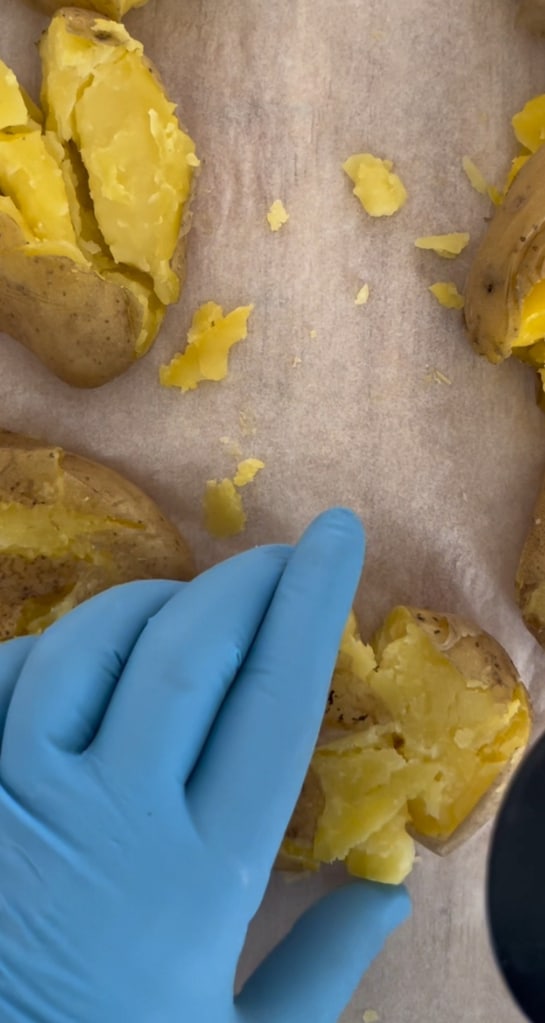 Placer deux pommes de terre sur une feuille de papier sulfurisé. Assaisonner avec du sel, du poivre, de l’origan, du cacioricotta et de l’huile d’olive extra vierge.