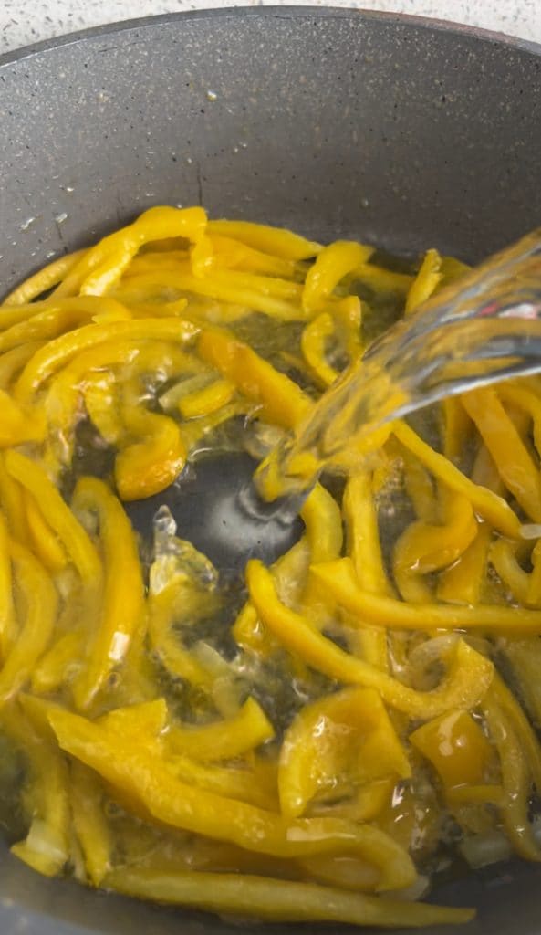 Ajouter les poivrons lavés, bien séchés et coupés en fines lanières (enlever surtout la partie blanche du poivron)