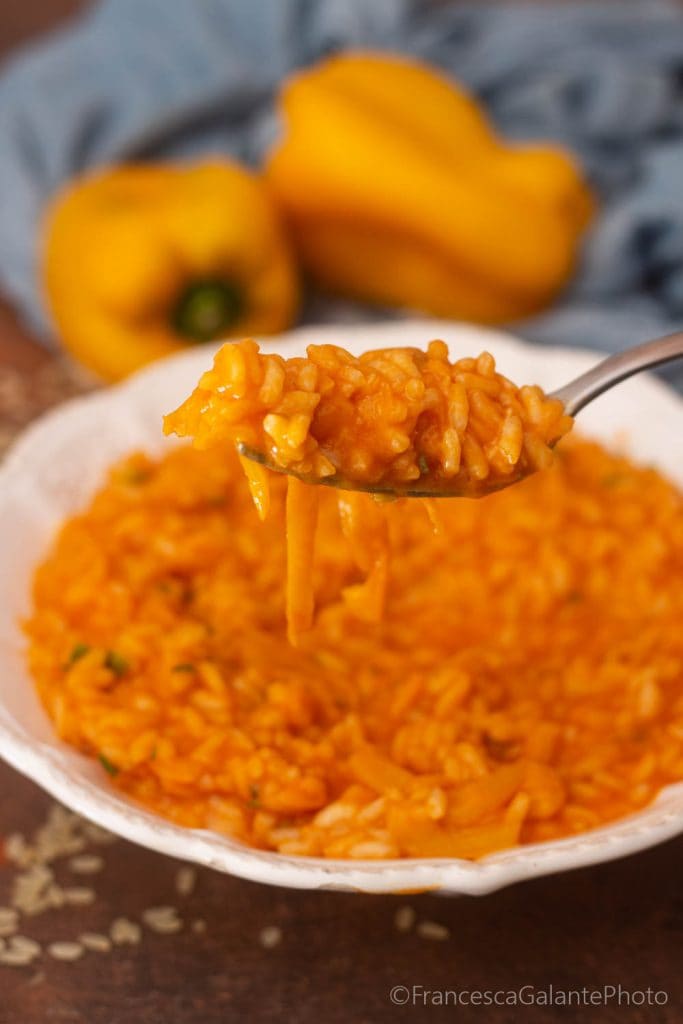 Amis, aujourd’hui une recette délicieuse et surtout très facile, le RISOTTO AUX POIVRONS CRÉMEUX. En ce moment, j’aime particulièrement réaliser des risottos, en effet, si vous jetez un coup d’œil sur mon blog, vous en trouverez vraiment beaucoup. Simple et percutant, parfait si vous avez besoin d’une idée de plat principal léger mais en même temps riche en goût, grâce à la crémosité. Naturellement, j’ai utilisé des poivrons jaunes parce que c’est ce que j’avais, mais si vous pouvez, utilisez aussi des rouges et des verts pour donner plus de couleur à l’assiette. Idéal aussi pour nos soirées d’été. Voici la recette ci-dessous