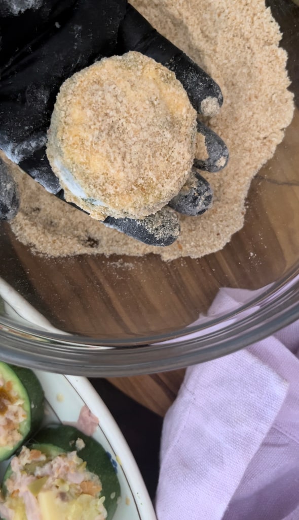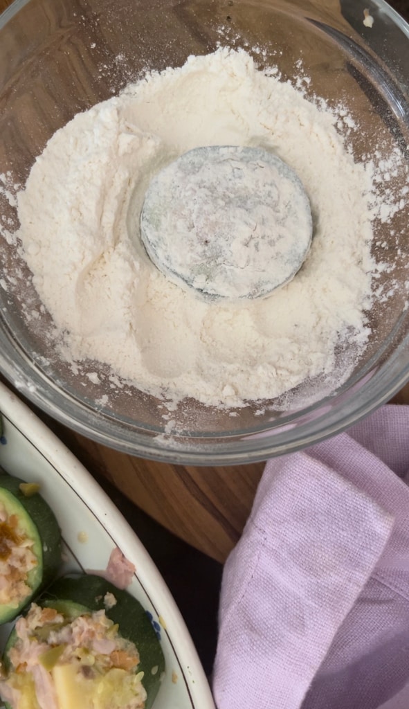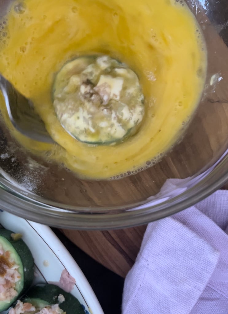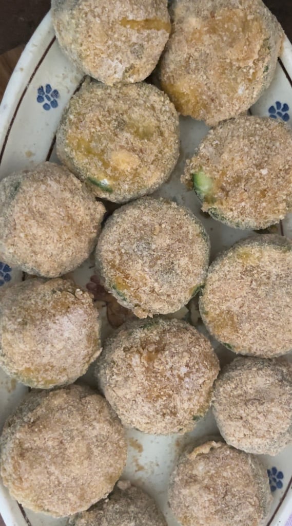 Bien les amies, aujourd’hui une recette super savoureuse, LES RONDELLES DE COURGETTES FARCIES PANÉES ET FRITES. Ceux qui me suivent savent que moi et l’art de « que cuisiner aujourd’hui, je n’ai pas envie de sortir, je fais avec ce que j’ai » allons très bien ensemble. Dans ce cas, j’avais à disposition deux courgettes, une poignée d’olives vertes à consommer, des tomates séchées et du jambon laissés là seuls dans le frigo que personne ne voulait, sauf mon malamute Axel qui, comme vous pouvez le voir dans la vidéo, ne laisse pas passer une tranche de jambon sous son nez 😜, puis du pain rassis. Je vous assure qu’il en est sorti une petite recette à reproduire quand on a des invités… Essayez-les!!!!