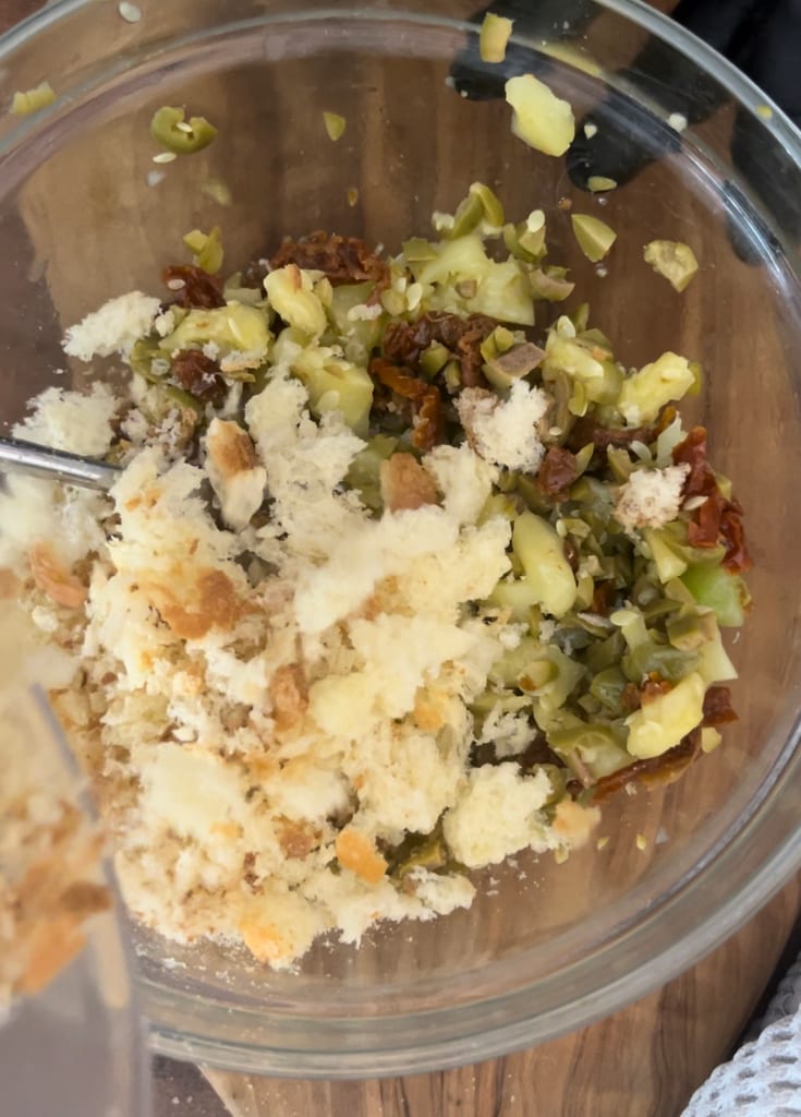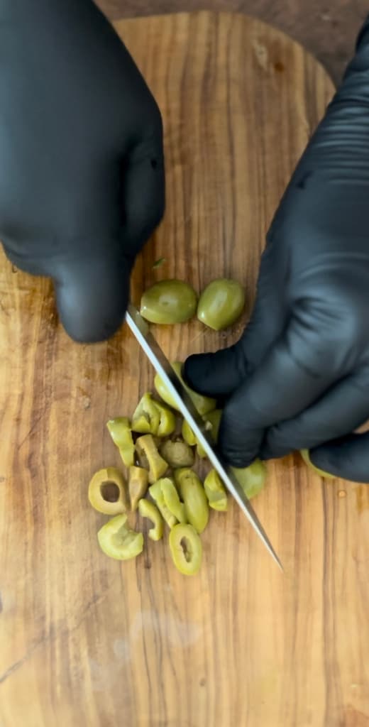 Émincer les olives vertes et les ajouter dans le bol avec la pulpe de courgette.