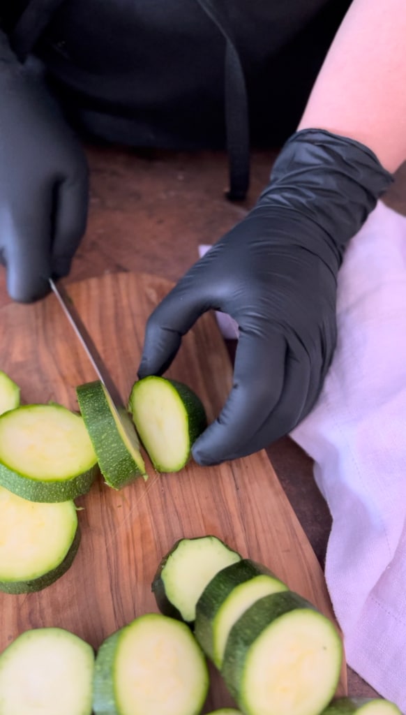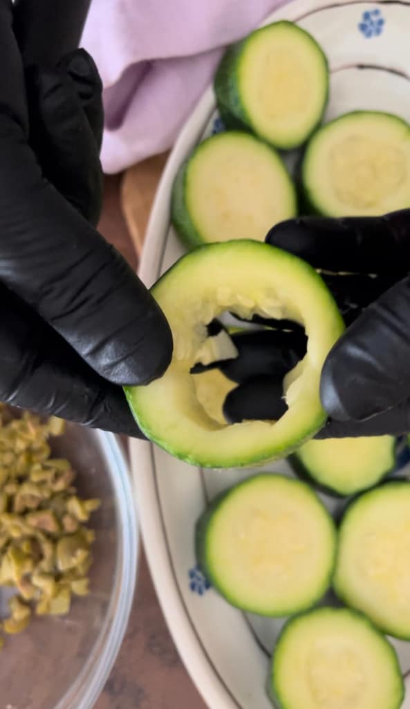 Tout d’abord, couper les courgettes en rondelles pas très fines car elles doivent contenir la farce.