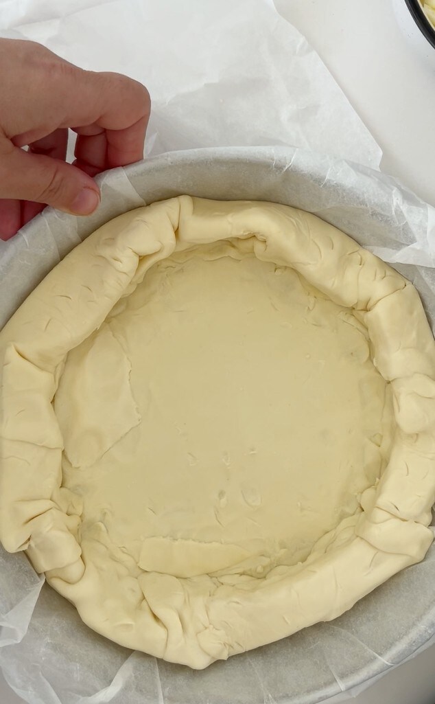 Recouvrir le moule à gâteau de 22 cm avec la pâte feuilletée ronde