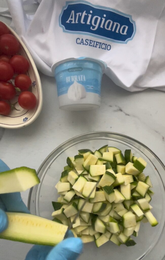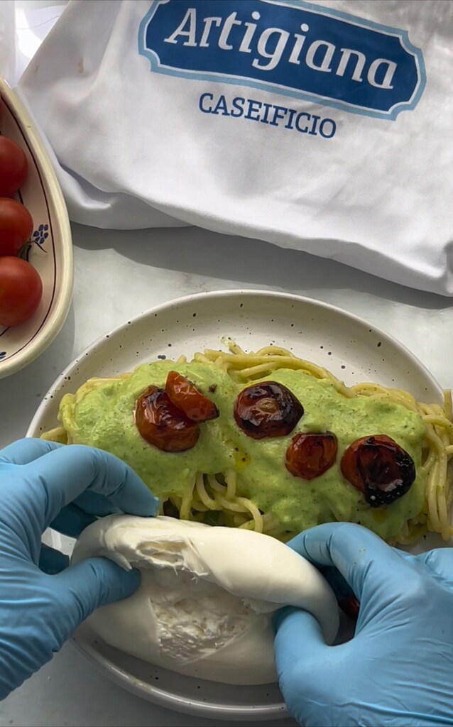 Les spaghettis crémeux aux courgettes confites et burrata sont un plat principal raffiné et savoureux, parfait pour un déjeuner ou un dîner élégant. La douceur des courgettes confites se marie parfaitement avec la crémeux de la burrata, créant un contraste de saveurs irrésistible. Ce plat est relativement simple à préparer, mais nécessite un peu de temps pour la cuisson des courgettes confites. Le résultat final, cependant, en vaut la peine! Pour ce plat principal, j’ai choisi la burratina de la fromagerie Artigiana. Leur secret réside dans la qualité des produits laitiers artisanaux et dans la qualité du lait, dans le soin à chaque étape de la préparation et dans la maîtrise que leur terre transmet de génération en génération. Une quantité infinie de produits, de la burrata au caciocavallo à la stracciatella et tout ce que notre réalité fromagère des Pouilles peut nous offrir. Je vous conseille d’acheter leurs produits car ils sont vraiment de grande qualité.