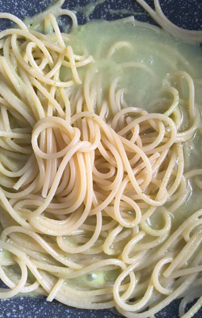 3 minutes avant la fin de la cuisson des spaghettis, les égoutter en réservant l’eau de cuisson et les risotter avec une louche d’eau et la crème obtenue, en en laissant un peu de côté.
