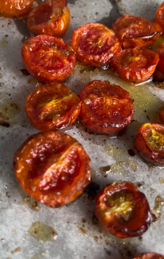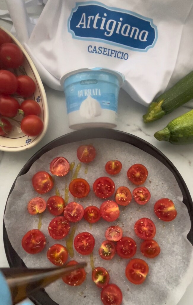 Commencer par préparer les tomates confites. Sur une plaque recouverte de papier sulfurisé, disposer les tomates coupées en deux avec la partie intérieure tournée vers le haut. Assaisonner avec un peu de sel, sucre, origan et huile d’olive. Cuire au four statique à 100°C pendant environ 2 heures. Naturellement, les confits nécessitent une cuisson lente, mais si vous êtes pressé, augmentez la température du four et cela prendra moins de temps.