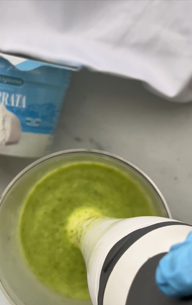 Une fois la cuisson terminée, les verser dans un récipient, ajouter le grana et utiliser le mixeur plongeant pour réduire en crème
