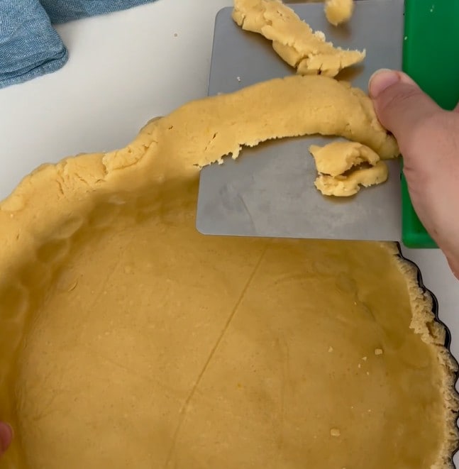Installer la pâte sablée dans le moule et retirer l’excédent qui dépasse. Avec le reste de pâte, nous pouvons préparer de simples biscuits.