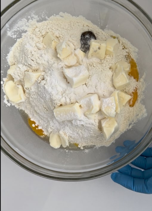Dans un bol, insérer les ingrédients pour la pâte sablée à savoir la farine, les œufs, le sucre, le beurre mou, l’extrait et la levure.