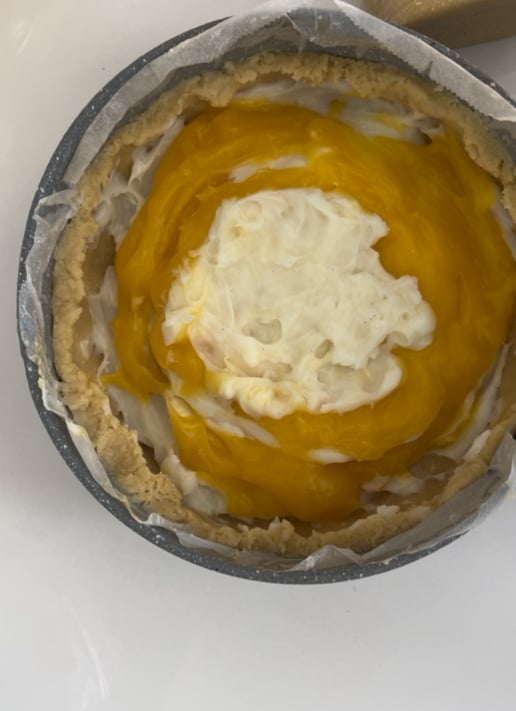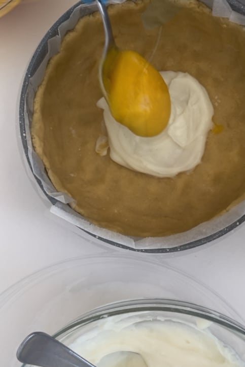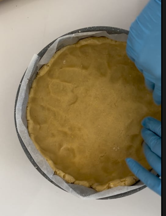 Avec l’autre morceau, recouvrir le moule. J’ai utilisé un moule à charnière de 22 cm recouvert de papier sulfurisé. Mettre au réfrigérateur