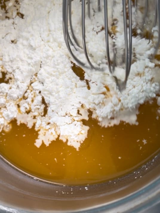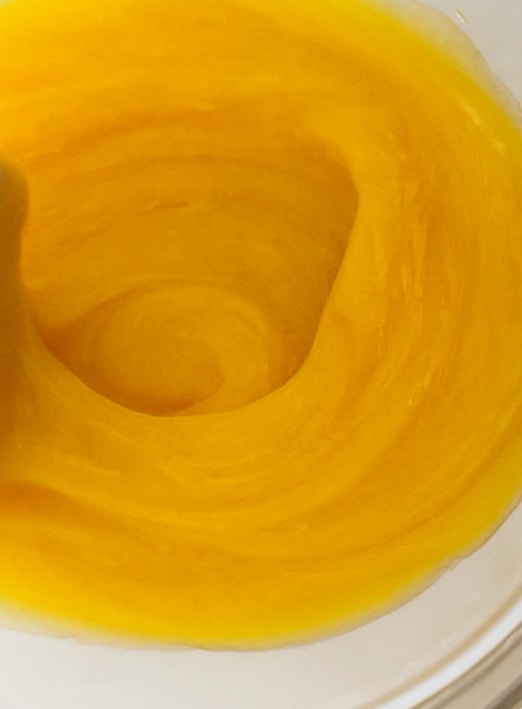 Entre-temps, prendre une casserole et verser le jus d’orange, le sucre et la fécule de maïs. Mettre sur le feu et fouetter rapidement