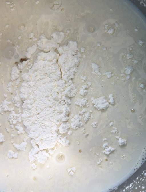 Prendre une autre casserole et verser le lait, le sucre et l’amidon. Mettre sur le feu et remuer