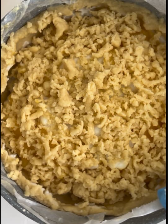 Avec une râpe à gros trous, râper le morceau de pâte mis de côté sur la tarte et cuire au four statique à 175° pendant 30 min. Saupoudrer de sucre glace