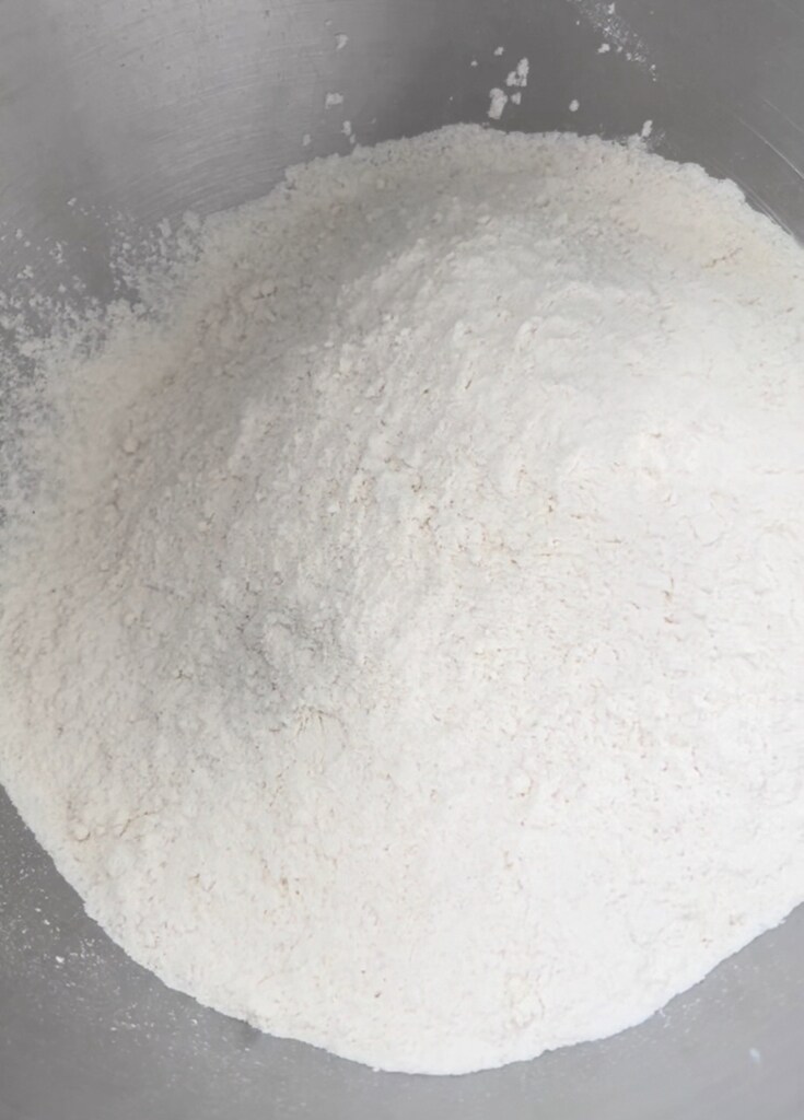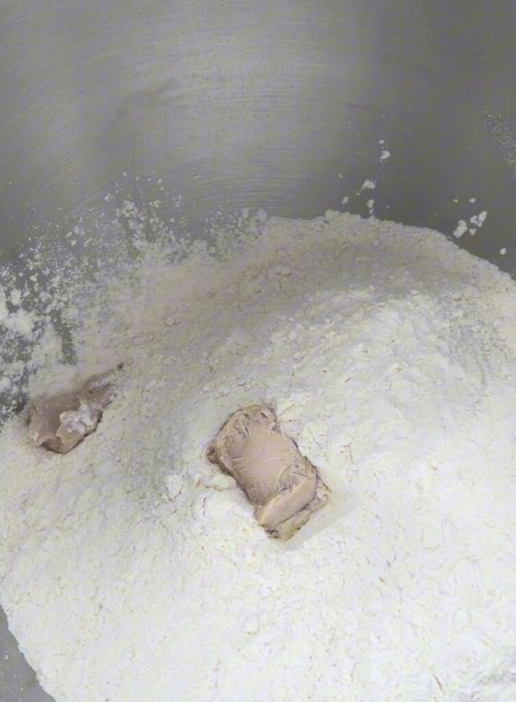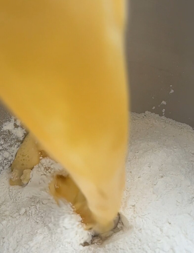 Dans un robot pâtissier, ou si vous préférez, vous pouvez aussi travailler le mélange dans un grand bol à la main, verser la farine