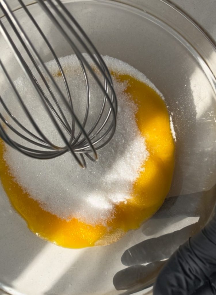 Dans un bol, mélanger le sucre et les œufs avec un fouet