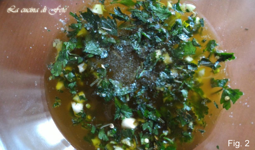 Pendant ce temps, dans une terrine, faites un hachis de persil, de menthe, de gousse d’ail écrasée ou finement hachée, de sel et de piment, puis émulsionnez le tout avec l’huile.