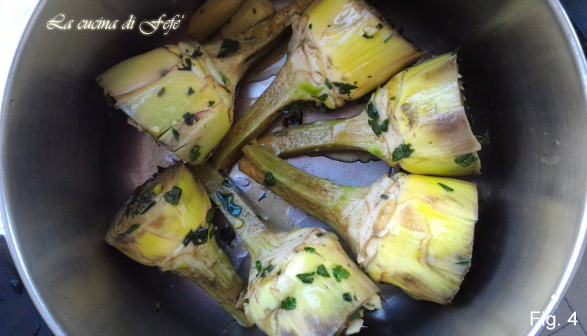 Fermez la casserole avec un couvercle et dès qu’elle commence à bouillir, baissez le feu et laissez cuire pendant environ 25′-30′*. Pendant la cuisson, remuez de temps en temps la casserole, mais sans toucher les artichauts. Au terme du temps, découvrez et vérifiez la cuisson, ils seront prêts lorsqu’ils seront très tendres et que les dents d’une fourchette pénétreront facilement.