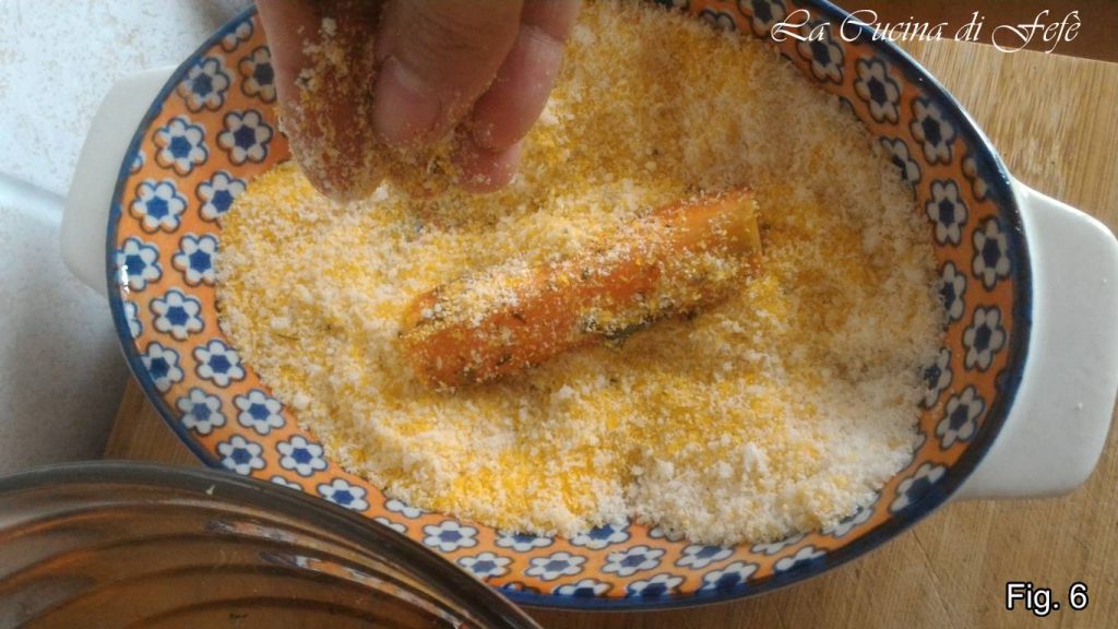 Passez les bâtonnets de carottes dans la panure de maïs et fromages et pressez avec les mains pour faire adhérer de tous les côtés (fig. 6).