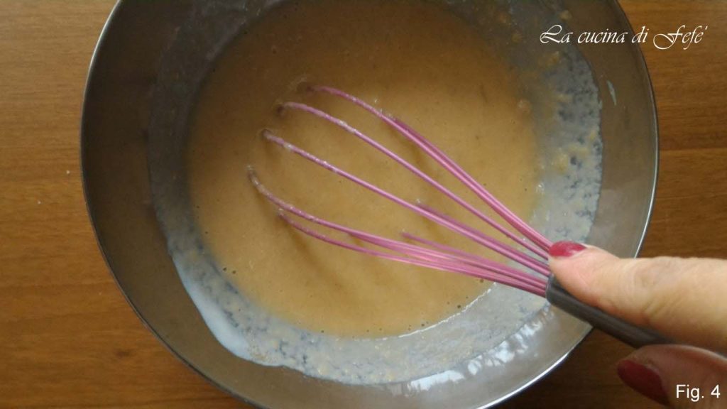 Ajoutez également l’œuf, l’arôme d’orange, le lait et le sucre et commencez à travailler avec un fouet à main.