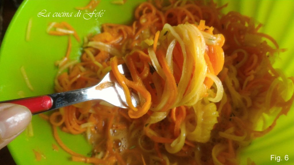 Chauffez l’huile pour la friture dans une poêle antiadhésive et enroulez un peu de spaghettis de pomme de terre et de carottes autour des dents d’une fourchette (fig. 6).