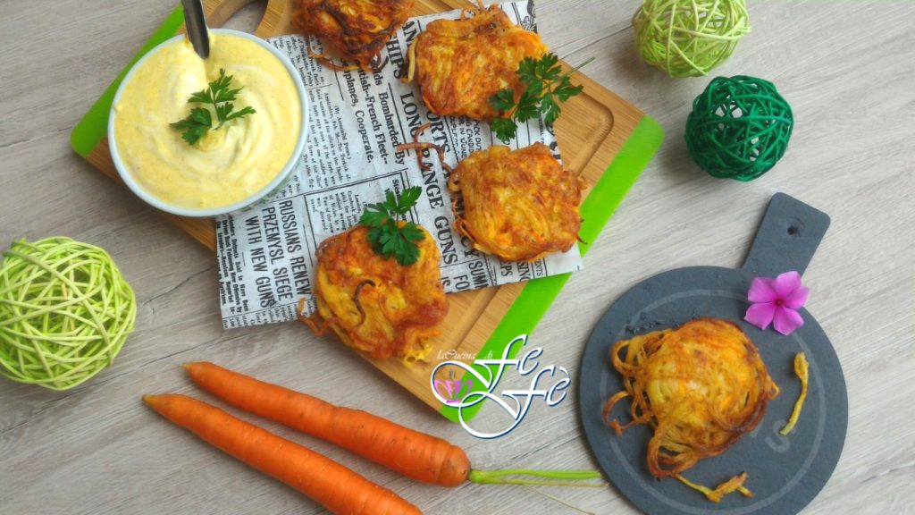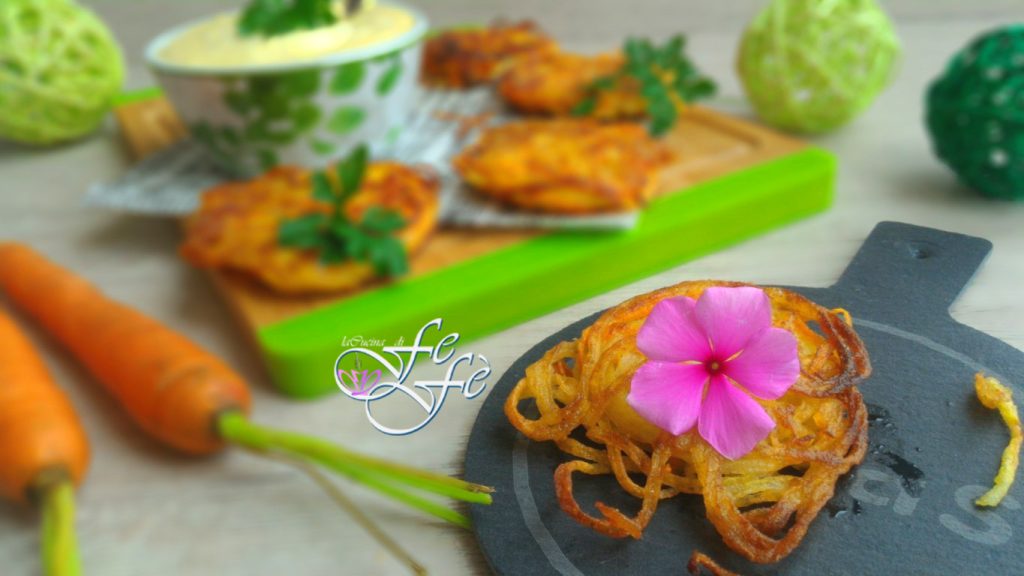 Je pense que vous avez compris maintenant que je suis une amoureuse de tous ces plats ou snacks à base de légumes, mais ce qui m’attire le plus et vers quoi j’éprouve une forte instinctivité, c’est avant tout la manière dont je pourrais les cuisiner et les déguster ! Les spaghettis de légumes sont ma passion principale, surtout depuis que j’ai acheté il y a quelques années le spiraliseur électrique. J’étais vraiment séduite par l’idée de créer des plats alternatifs et plus sains, où la créativité serait exaltée au maximum. Préparer des spaghettis avec des légumes au lieu des pâtes classiques, trop riches en glucides pour mes goûts, cela a été le coup de foudre ! En plus, je me suis aussi rendu compte que j’en tirais un certain bénéfice en termes de santé physique, ce qui ne gâte rien ! Ces plats peuvent être très personnalisés, car il y a de nombreuses sauces pour les accompagner et de nombreux ingrédients pour les mettre en valeur. Ils sont excellents même pour créer des recettes orientales ou ethniques, comme je les aime, alors de temps en temps je vous proposerai quelque chose d’étrangement exotique que j’espère recevra votre approbation. En attendant, je vous laisse la recette de ces délicieux beignets de spaghettis de carottes et pommes de terre, qui par un cas absolument extraordinaire, ne sont pas cuits au four comme c’est ma coutume, mais frits ! Eh bien oui, ils sont frits et j’en suis fière ! De temps en temps, un écart à la règle est permis ! Un street food parfait et original à préparer pour un dîner informel entre amis ou comme plat principal végétarien adapté à toute la famille ! En fait, vos enfants en raffoleront ! Si vous ne possédez pas de spiraliseur, pas de panique, vous pouvez certainement râper les carottes et les pommes de terre avec un effet final vraiment très similaire au mien. Ce sera vraiment amusant de créer ces beignets et de les accompagner, comme je l’ai fait, avec une sauce au yaourt et à la curcuma ou une salade fraîche de saison.