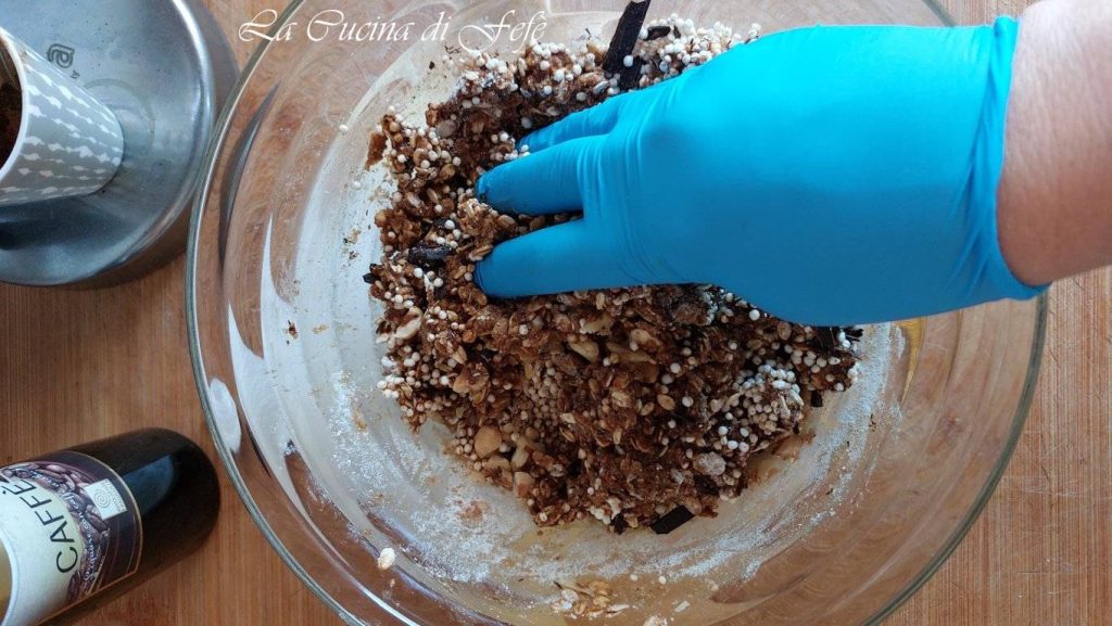 Commence maintenant à pétrir avec les mains directement dans le saladier. Si la pâte est encore trop humide, ajoute une cuillère de farine d’avoine ; au contraire si elle est trop sèche, un peu de café ou de lait végétal en plus.