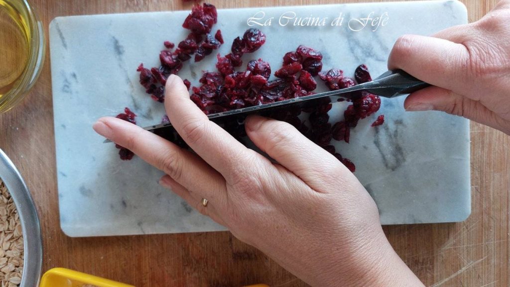 • Préparer les biscuits à l’avoine, coco et cajou est vraiment simple. Commencez par hacher finement les canneberges séchées au couteau.