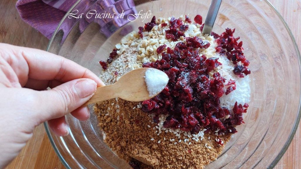 • Enfin, incorporez les canneberges séchées et les noix de cajou hachées précédemment et un pincée de sel si vous aimez le contraste sucré-salé ; sinon c’est optionnel.