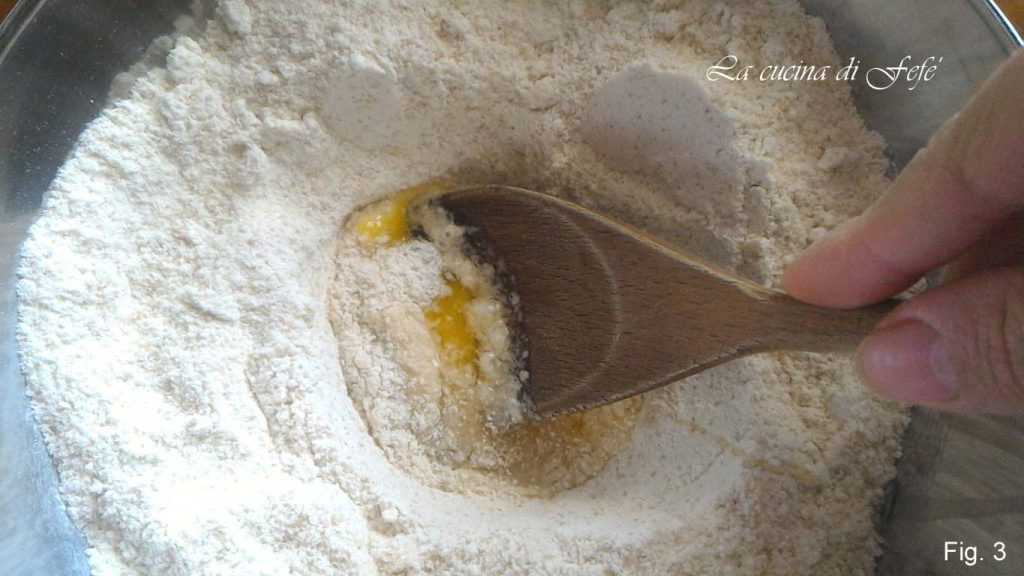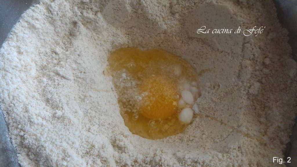 Faites un puits et ajoutez l’œuf avec une pincée de sel (fig. 2).