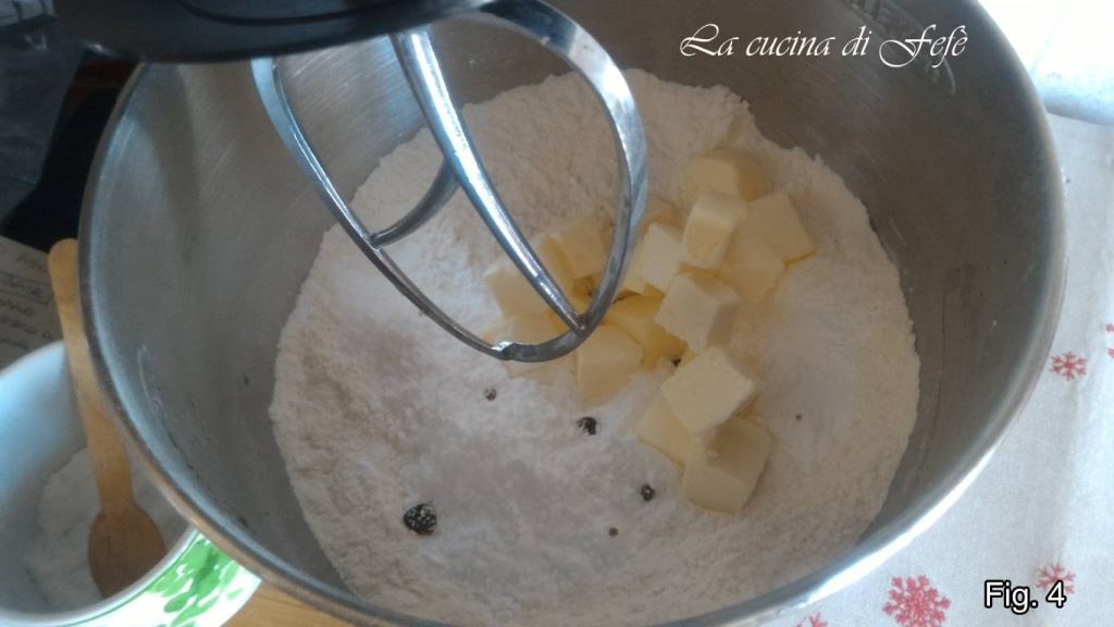 Ajoutez la pincée de sel et le beurre froid coupé en cubes (fig. 4).