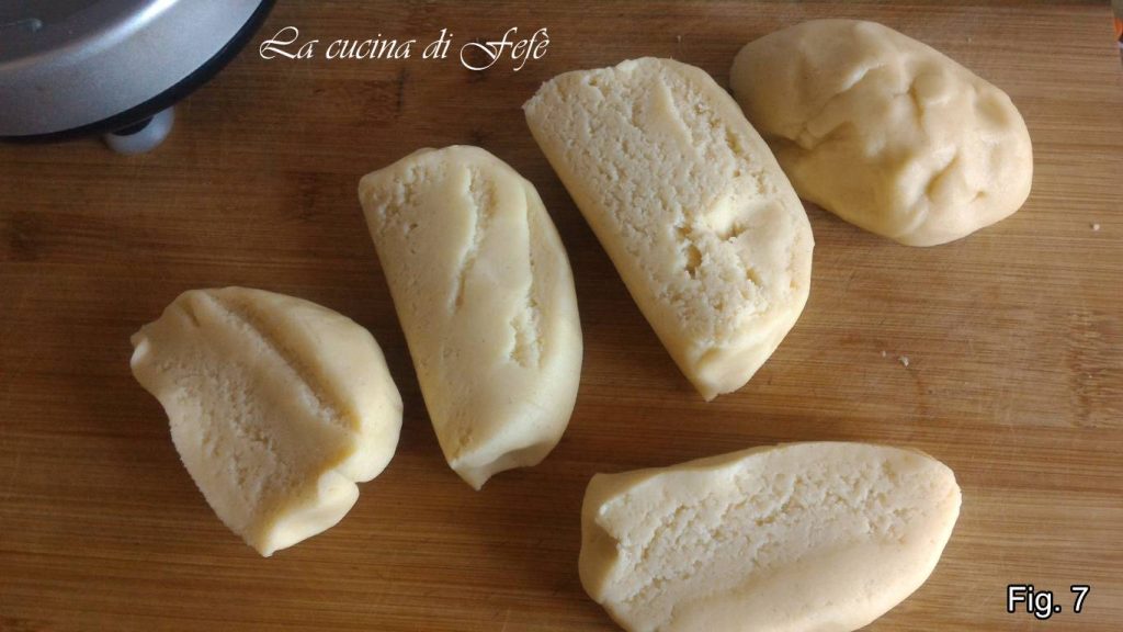 Divisez la pâte obtenue en 5 parts égales, pour plus de facilité il sera utile de les peser. Enveloppez-les de film alimentaire et laissez-les 10′ au congélateur (fig. 7).