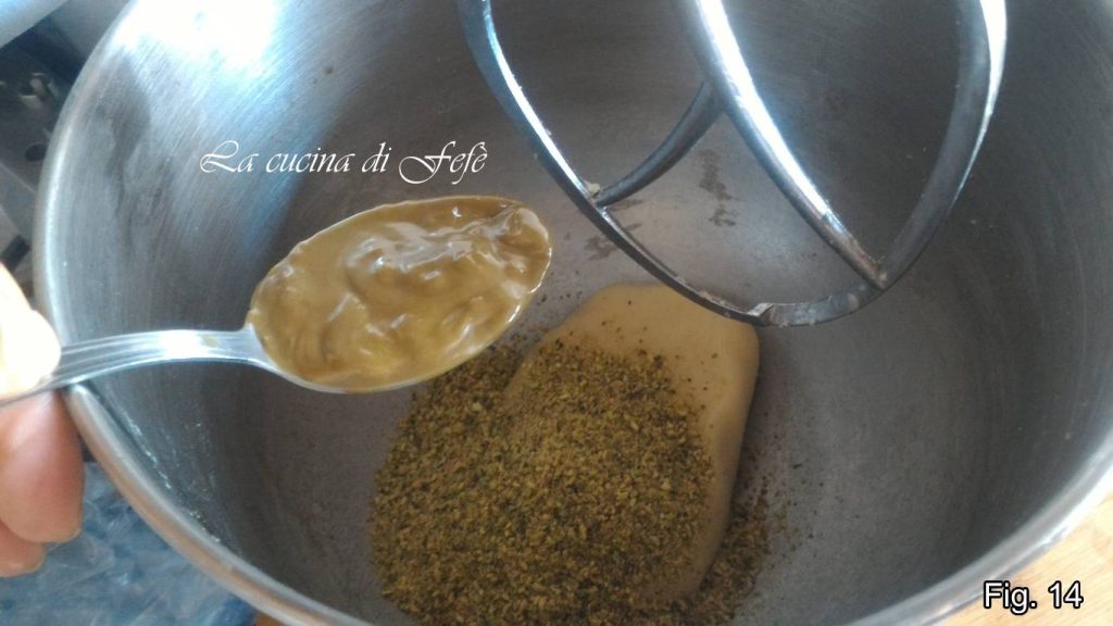 Mélangez avec le crochet K pendant quelques minutes jusqu’à obtenir un mélange homogène. Aplatissez-le, enveloppez-le dans son film alimentaire et placez-le au réfrigérateur 20′ (fig. 13).