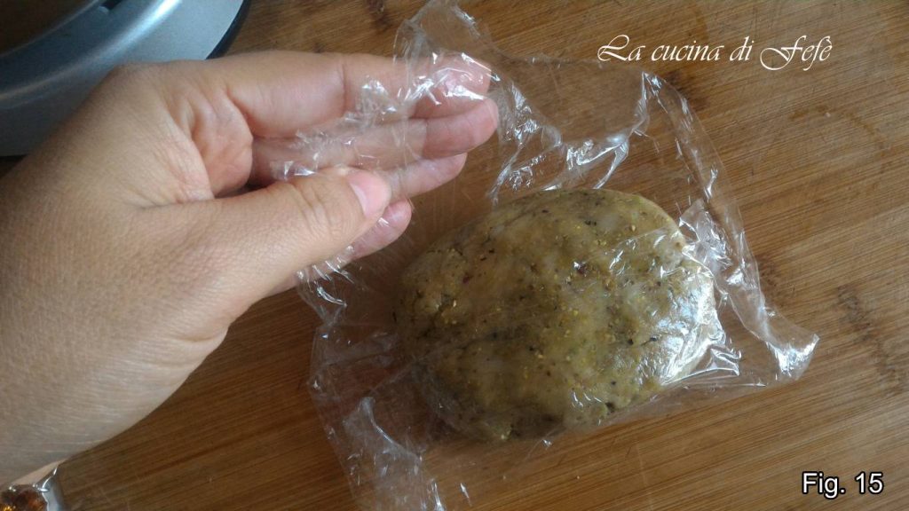Mélangez avec le crochet K pendant quelques minutes jusqu’à obtenir un mélange homogène. Aplatissez-le, enveloppez-le dans son film alimentaire et placez-le au réfrigérateur 20′ (fig. 15).