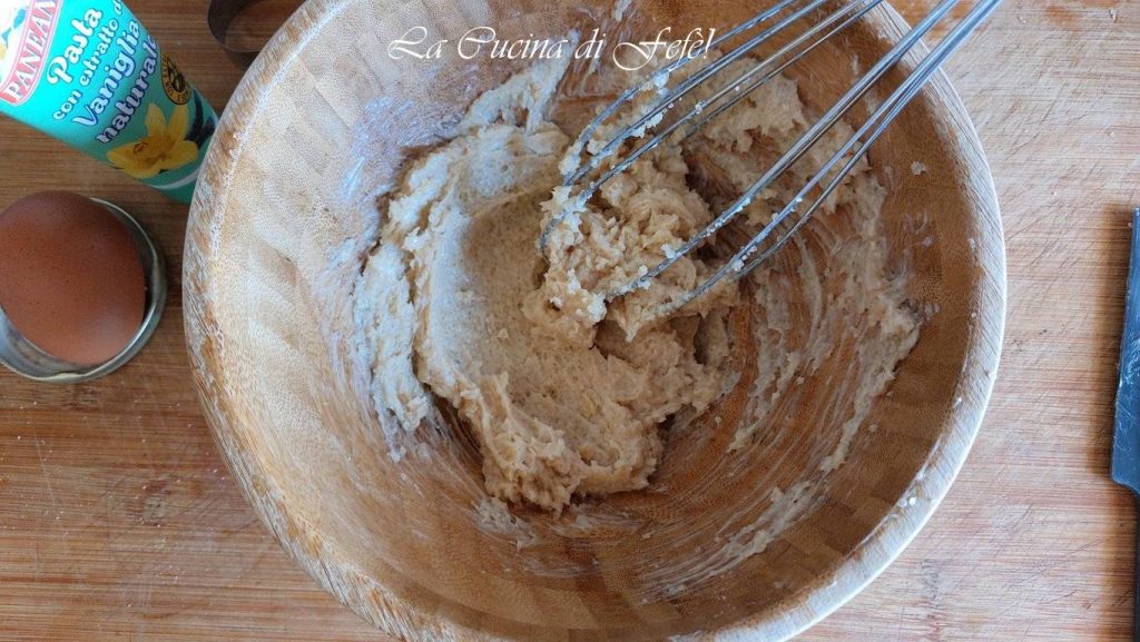 Dans une grande terrine, travaille avec un fouet à main le beurre mou sorti du frigo depuis au moins 30′ avec le sucre de canne.