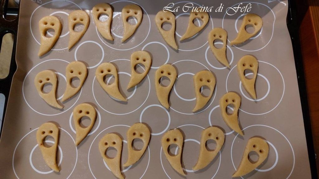 Ces dernières années, j’ai découvert un intérêt pour la fête d’Halloween que je n’avais jamais eu auparavant, n’étant toujours dans mon esprit qu’une fête adoptive qui ne faisait pas partie de notre culture! En plus, trop commerciale, donc peu attrayante à mes yeux. Pendant des années, j’ai laissé de côté toute possibilité de créer quelque chose en cuisine qui pourrait en rappeler la signification. Et pourtant, au-delà de sa nature commerciale, cette fête a trouvé sa place dans le tissu social italien. Elle est devenue un prétexte pour se rassembler, organiser des fêtes, stimuler la créativité des petits et pas seulement! Après tout, il n’y a rien de mal à emprunter une tradition si cela nous permet de passer des moments de plaisir, n’est-ce pas? Et ainsi, j’ai découvert combien il est amusant de réaliser les classiques et effrayants petits gâteaux à thème du célèbre leitmotiv « trick or treat » ! Cette année, après les petites araignées et les momies, c’est donc au tour des biscuits fantômes. Ce sont les biscuits d’Halloween les plus viraux du web et j’ai choisi de les réaliser avec une pâte sablée aux amandes similaire à la traditionnelle mais plus friable et croustillante. L’important est de laisser reposer la pâte au réfrigérateur pendant au moins 2 heures ou même plus avant de l’utiliser, car cela fera la différence lors de l’étalement! Ils peuvent être réalisés simplement, avec juste une pincée de sucre glace en surface, déjà incroyables ainsi, ou encore plus gourmands garnis de crème à tartiner aux noisettes. En fonction de cela, l’épaisseur des biscuits et le nombre total changeront. Les enfants en seront fous, ils seront super spectaculaires et parfaits pour égayer leurs moments de fête! Ils disparaîtront en un rien de temps!