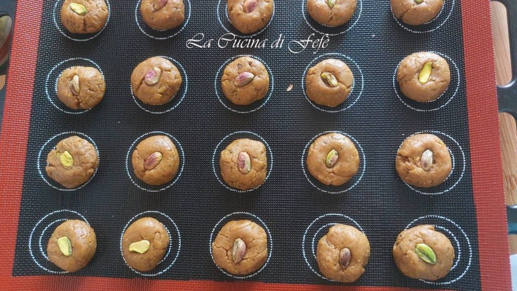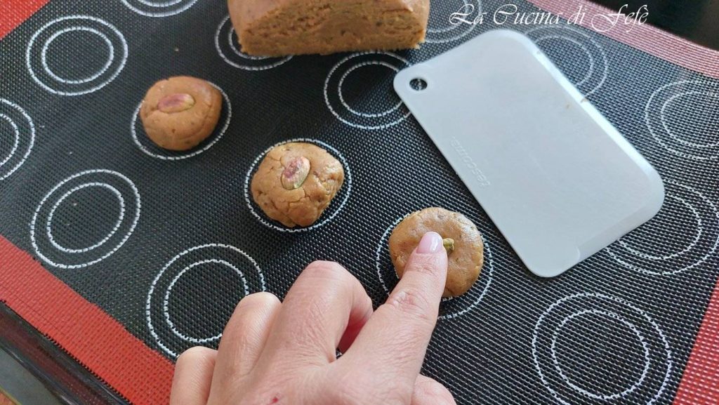 • Dépose-les sur une plaque recouverte d’un tapis réutilisable ou de papier sulfurisé, en les espaçant d’environ 3 cm. Aplatis-les légèrement avec la paume de la main ou avec les dents d’une fourchette pour un effet rustique et ajoute une pistache entière sur le dessus de chaque biscuit avant de le faire cuire.