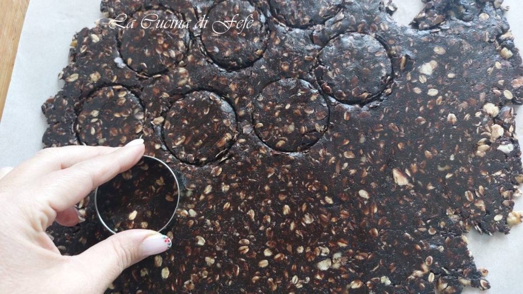 Avec l’aide d’un emporte-pièce unique Ø 5 cm, forme les biscuits à l’avoine et cacao.
