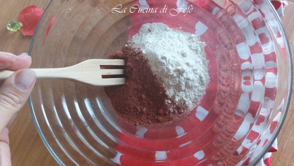 Dans un bol ou un robot de cuisine, mélange les farines de betterave et type 1 tamisées préalablement.