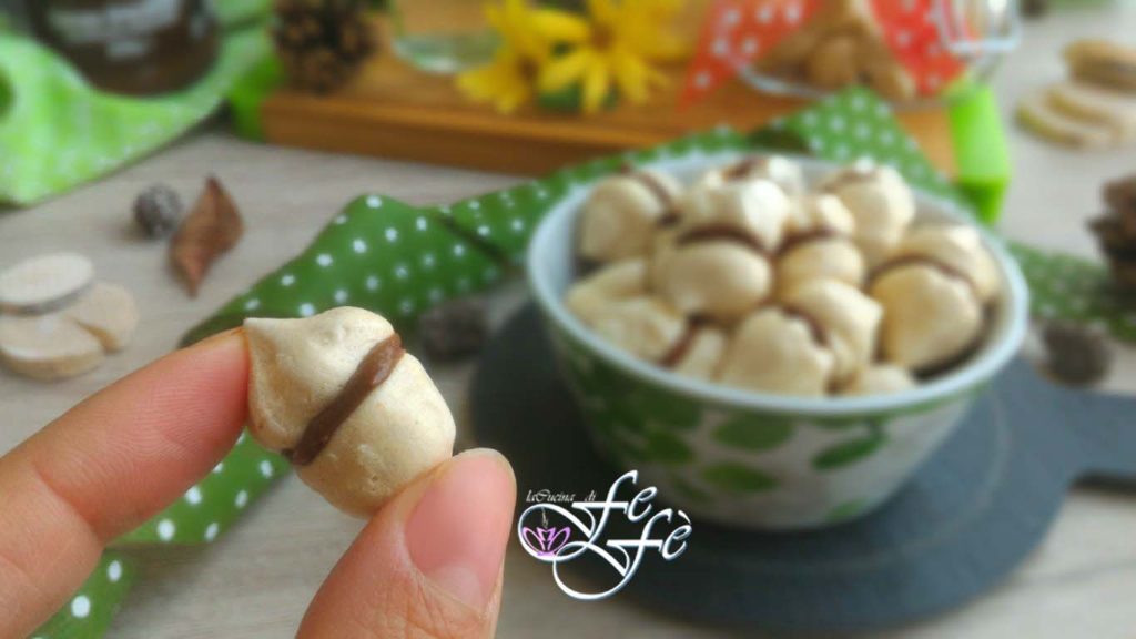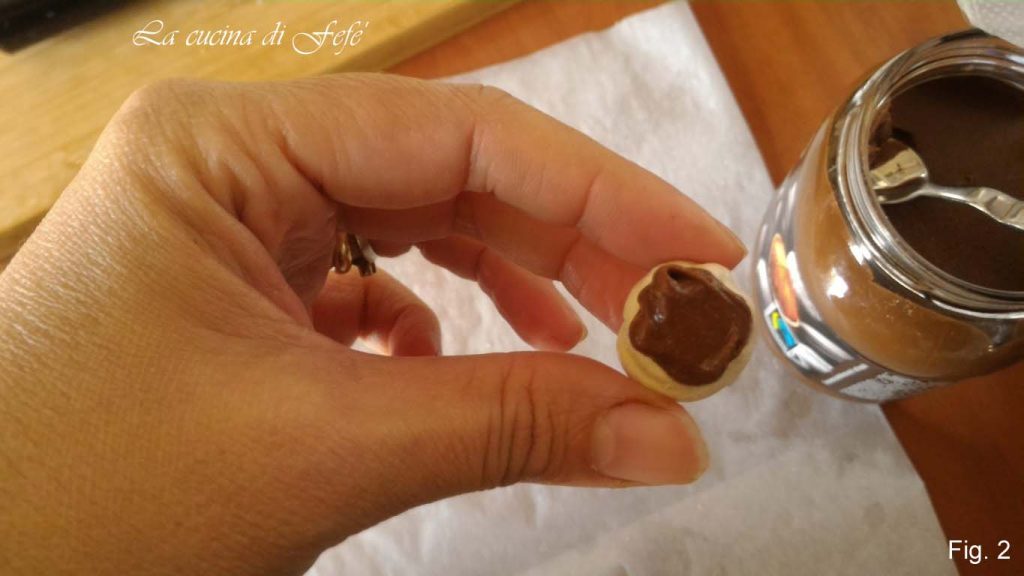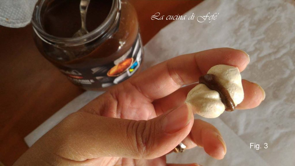 Le jour suivant, étalez la pointe d’une cuillère, sans exagérer, sur la base d’une mini meringue avec la crème à tartiner aux noisettes .