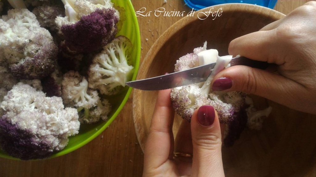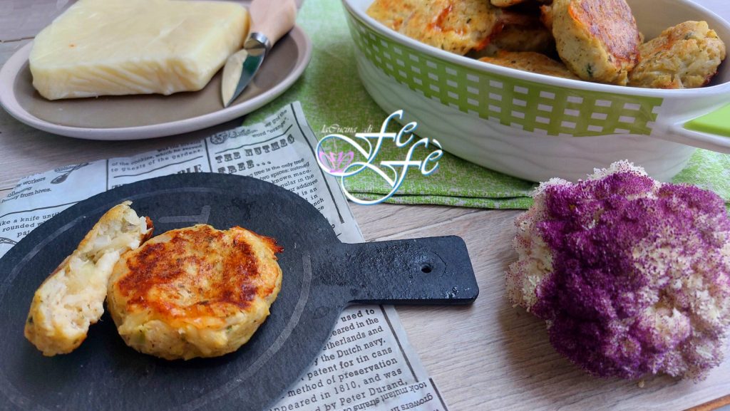 Il y a quelque temps, je me souviens avoir dégusté dans une trattoria familiale, dans le centre historique de Catane, des boulettes de chou-fleur vraiment tendres et savoureuses ! Ce n’était pas tant ce qu’il y avait dedans qui les rendait si appétissantes, mais le fait d’utiliser simplement le chou-fleur local, également connu sous le nom de Violet de Sicile, au goût plus doux et moins amer que le blanc ! De plus, sa couleur si vive et extravagante est due à sa haute concentration en antioxydants, les anthocyanes, une classe de flavonoïdes qui aide le corps à combattre les radicaux libres ! Bref, l’alliance bon et sain, est assurée ! À cette occasion, ces boulettes furent servies parmi les antipasti typiques siciliens, et bien sûr rigoureusement frites, mais je vous assure que même cuites au four elles sont vraiment délicieuses et vous pourrez également les servir comme plat principal en style végétarien ! J’ai essayé de respecter la simplicité de la recette, car cela reste un plat de la tradition paysanne, fait avec peu d’ingrédients authentiques, dont le pecorino sicilien, mais j’ai choisi de les rendre encore plus gourmandes en ajoutant à l’intérieur un beau cube de canestrato tuma, typique de ma région, dont je suis très friande !!! Le résultat ? Époustouflantes, elles fondent dans la bouche et le goût est comme je m’en souvenais, authentique et savoureux ! Si vous avez la possibilité de vous procurer ce type de chou-fleur, essayez-les parce qu’elles deviendront un incontournable de votre cuisine et disparaîtront en un rien de temps !