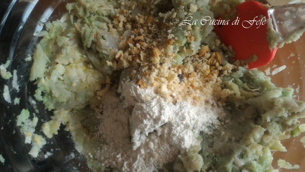 Mélangez avec une spatule ou une cuillère et enfin ajoutez la farine et la chapelure. Mélangez à nouveau, couvrez d’un film alimentaire et laissez reposer au réfrigérateur pendant 1 h. De cette façon, la chapelure absorbera tout excès d’humidité.