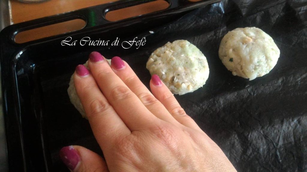 Formez les boulettes petit à petit de cette manière, et disposez-les, en les aplatissant légèrement avec les mains, sur une plaque de cuisson recouverte de papier sulfurisé ou de feuille en téflon recyclable