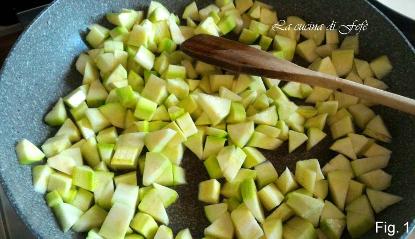 Lavez soigneusement les courgettes et coupez-les en morceaux. Dans une grande poêle, faites dorer la gousse d’ail avec deux cuillères à soupe d’huile d’olive extra vierge; ajoutez les courgettes et faites-les sauter à feu vif pendant quelques minutes (fig. 1).