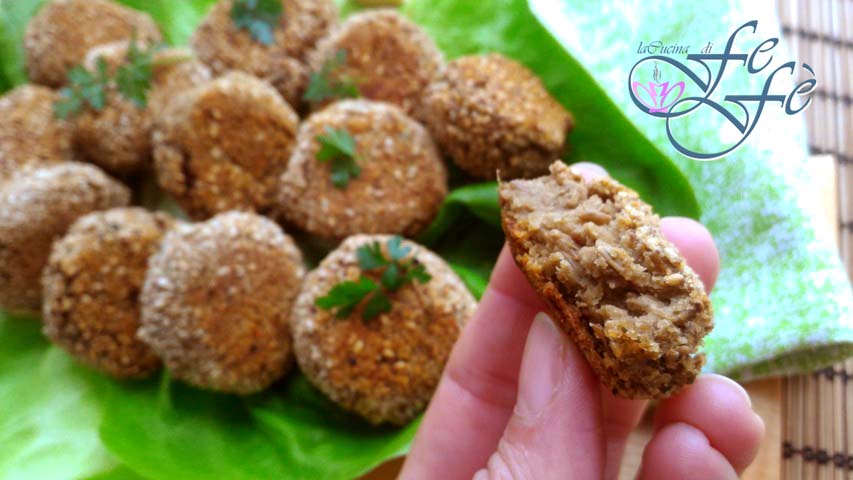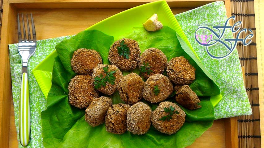 Combien d’entre vous ont reçu pendant les dernières fêtes les classiques paniers de Noël remplis de bons et délicieux produits à déguster ou à utiliser dans quelques recettes ? Parmi les nombreuses choses que l’on reçoit en quantité industrielle, les lentilles sont incontournables, car elles représentent certainement par excellence un symbole de bon augure pour commencer la nouvelle année avec prospérité ! Je ne sais pas pour vous, mais moi, après les avoir cuites dans des soupes, potages et veloutés (comme la soupe de cannellini et lentilles avec chou noir ou la soupe d’orge, lentilles avec fenouil et cannelle, la velouté de lentilles avec carottes au gingembre, juste pour en citer quelques-uns), je ne savais plus quoi en faire ! J’avais d’abord pensé à quelque chose de sophistiqué et à oser avec des flans hors du commun, mais il me manquait quelques ingrédients et j’ai dû renoncer. Alors, j’ai finalement opté pour des plus courantes boulettes, qui, pour carité, sont bonnes et très saines, mais pas pleinement satisfaisantes ! Puis l’illumination ! Dans le garde-manger, je me suis souvenu avoir un petit pot de graines de sésame blanc déjà grillées, un heureux reste d’utilisations précédentes. Le pas vers l’idée d’enrichir la panure a été court ! Comme on dit dans ces cas : nécessité fait loi ! Sans modestie, mais les lentilles cuisinées ainsi sont vraiment délicieuses et originales, parfaites pour des finger foods végétariens amusants et joyeux. Moelleuses à l’intérieur, croustillantes à l’extérieur avec cette belle croûte qui craque entre les dents. Cuites au four, elles sont très légères et digestes, mais vous pouvez très bien choisir de les cuire à la poêle pour les rendre encore plus savoureuses ! Servez-les avec une sauce d’accompagnement (Mayo fit ou sauce au yaourt et moutarde) et elles seront un excellent subterfuge aussi pour les enfants, toujours très réticents à consommer des légumes et des légumineuses en général.