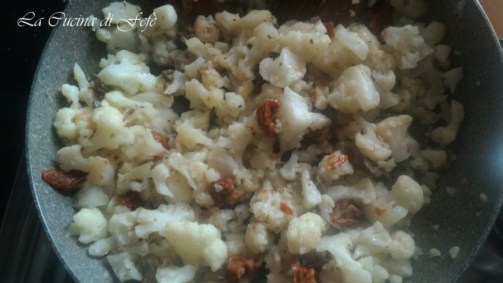 • Ajoutez également les tomates séchées hachées et les câpres préalablement dessalées sous l’eau courante, et faites revenir encore quelques minutes.