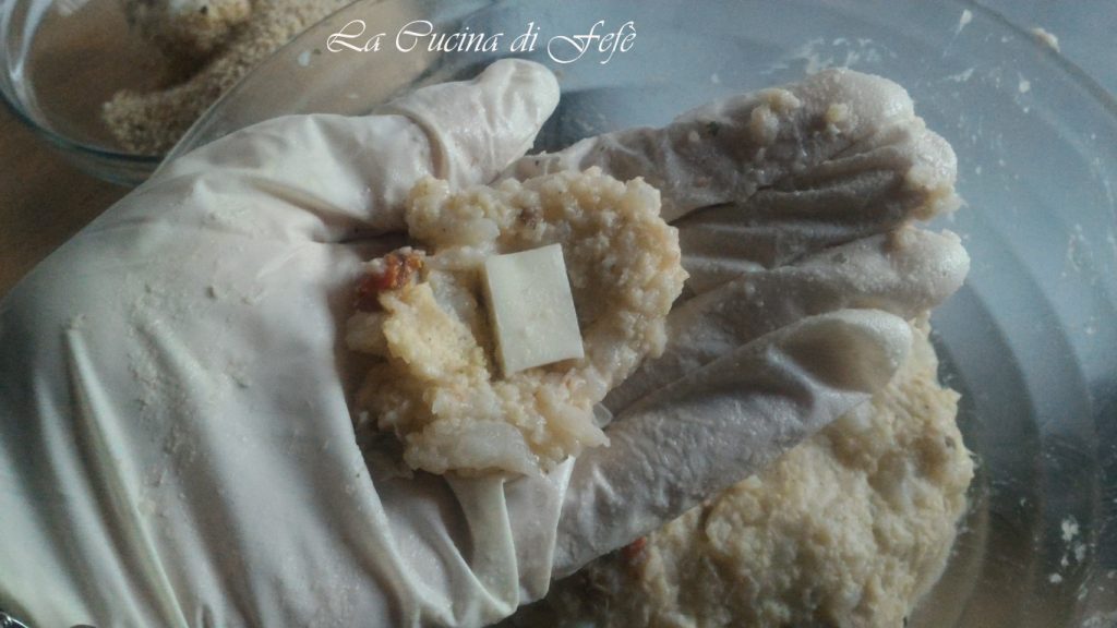 • Une fois ce temps écoulé, prélevez de petites portions de pâte, écrasez-la bien entre vos mains en la compactant et placez au centre un cube de scamorza.